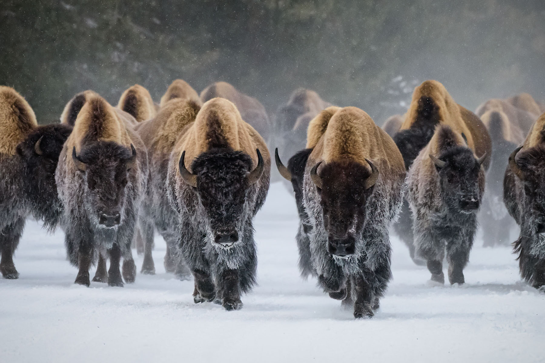 Winter means fewer crowds, incredible wildlife viewing, and geothermal features that look even more dramatic surrounded by snow and ice (definitely walk the boardwalks at Mammoth Hot Springs). Bison wander the roads between Mammoth Hot Springs and Lamar Valley, where wolves, elk, and bighorn sheep are easier to spot against the white landscape.